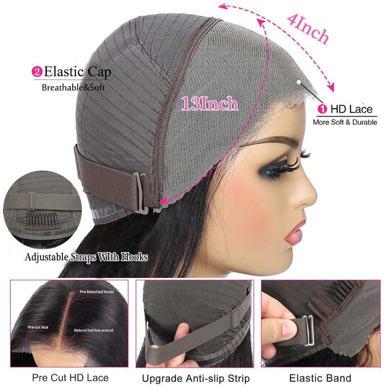 - 【13x4 Lace Front Wig Human Hair Advantage】:Glueless Wigs Human Hair Pre Plucked Pre Cut Lace and No Glue, Easy to Wear and Take Off. 3 Seconds to Install, Save Time, Beginners Friendly,No Skills Needed. Pre cut lace glueless wig wear and go,13X4 Hd lace closure Invisible Lace Area.Pre Plucked Hairline with Baby Hair,Ready to Wear Wigs Glueless Human Hair.