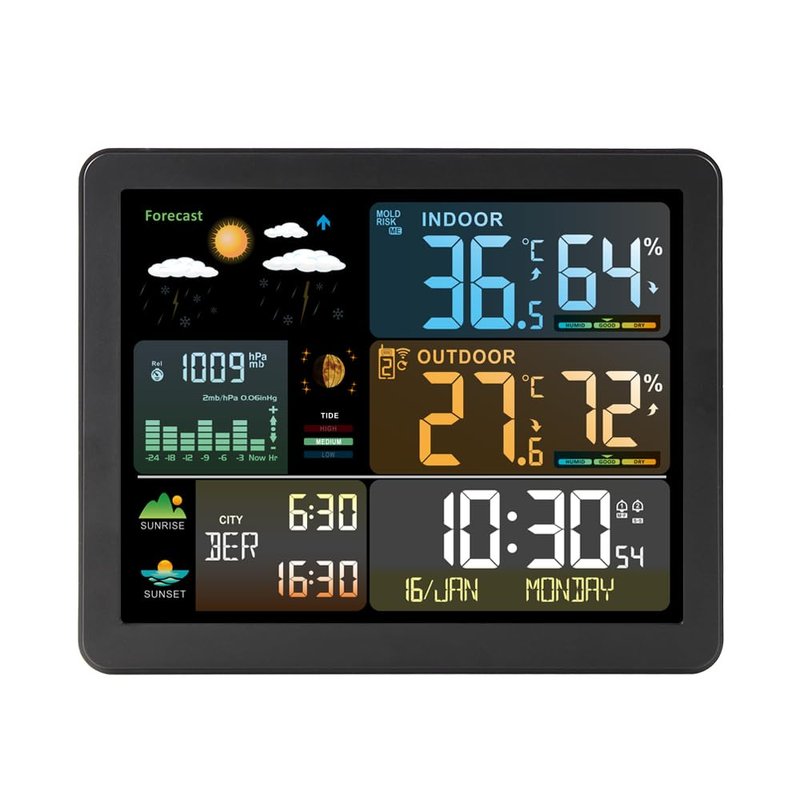 - [7.5" LCD Screen Weather Station] temperature&humidity monitor with large color display, which shows comprehensive information: inside outside temperature humidity(max/min, hi/lo),time/date, alarm clock/snooze, weather forecast (next 8-24 hrs) moon phase, barometric pressure.