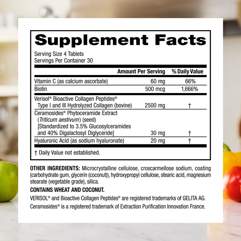 - Healthy Skin: Each serving contains 2,500 mg of Verisol Collagen, 500 mg Biotin, 30 mg of Ceramosides phytoceramide extract, 60 mg of Vitamin C and 20 mg of mg of Hyaluronic Acid. Together, this unique formula has been clinically shown to reduce fine lines around the eyes and deep wrinkles in 15 days.*