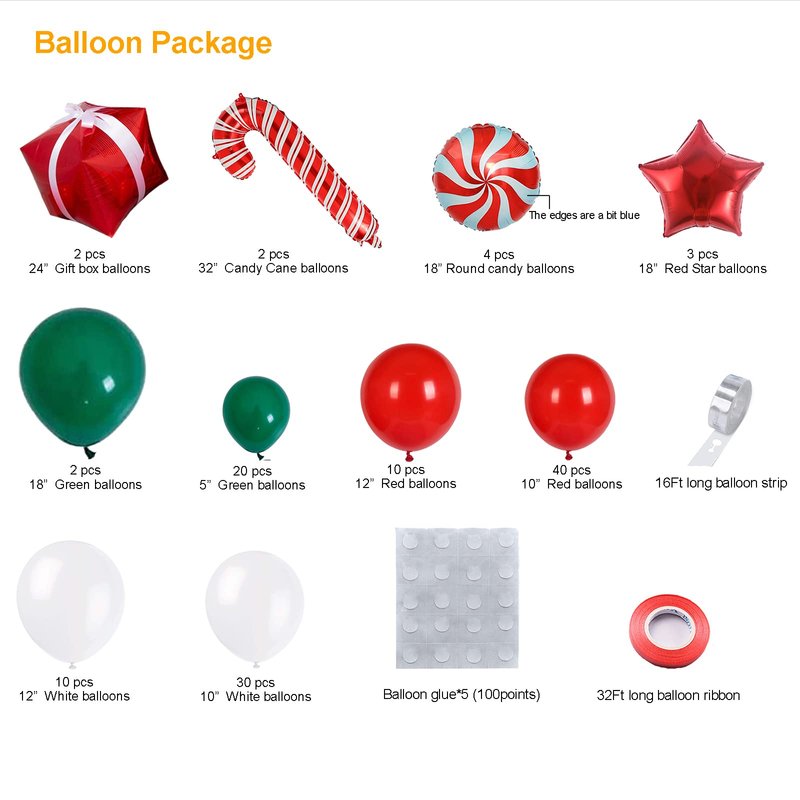 - Packaging Includes - red latex balloon(40pcs 10in+10pcs 12in) ,white latex balloon(30pcs 10in+10pcs 12in) ,dark green latex balloon(20pcs 5in+2pcs 18in),4pcs 18in candy balloon A little blue at the edges,3pcs 18in red star balloon,2pcs 24in gift box balloon,2pcs 32in Candy Cane balloon