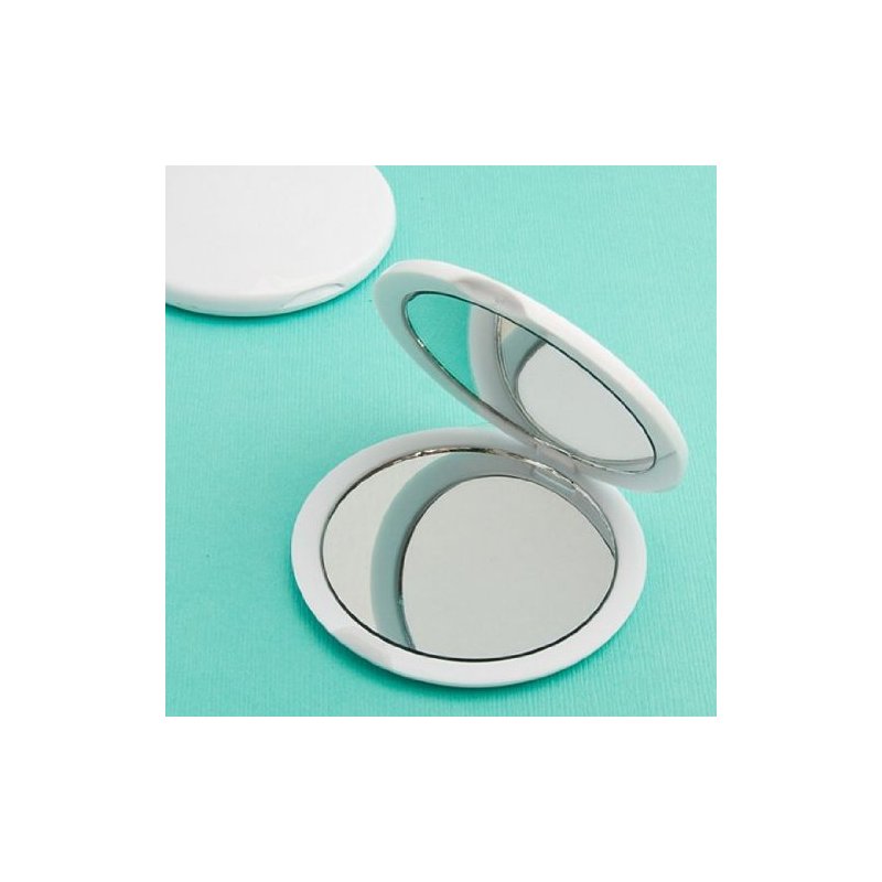 - Mirror compact has a double sided glass mirror interior with a sturdy white poly resin outer compact case