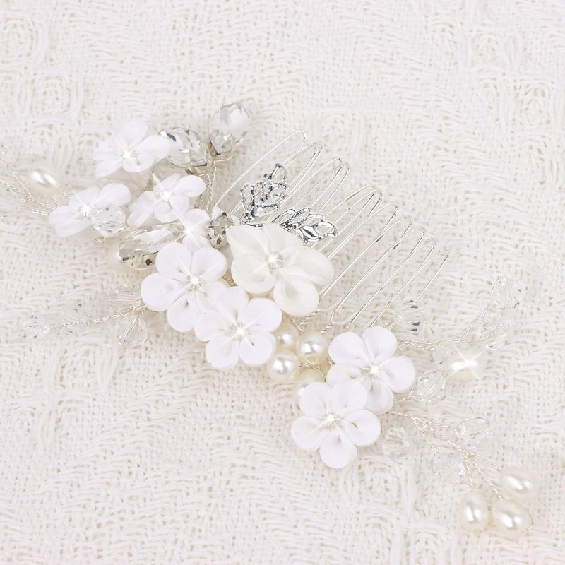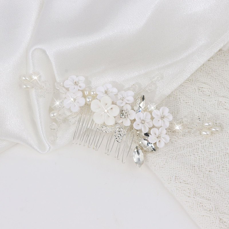 Indulge in timeless elegance with our exquisite hair accessories, meticulously crafted for the modern bride, bridesmaids, or any special occasion. Elevate your hairstyle with these stunning decorative hair combs, featuring a harmonious blend of lustrous pearls forming delicate floral motifs and shimmering rhinestone-studded diamond leaves. Crafted from premium materials, these updo hair accessories ensure both durability and comfort throughout your special day, making them the perfect hair jewelry for women seeking an extra touch of glamour. Whether you're adorning a classic up-do or accentuating loose waves, these hair side combs effortlessly secure your locks while adding a touch of enchantment. These fancy hair clips are not just bride must-haves for the wedding day but also make for a heartfelt gift for the bridesmaids, symbolizing appreciation and shared memories. Their unique design, a balance of sophistication and whimsy, transforms them into versatile hair ornaments suitable for first communion headpieces for girls or even as after-wedding outfit enhancements for the blushing bride. Embrace the beauty of nature-inspired adornments with our white hair accessories that effortlessly complement any bridal gown or evening ensemble. Designed to enhance hair updos with a touch of grace, these flower girl hair accessory are as functional as they are fashionable, securing even the most intricate hairstyles. For vintage enthusiasts, our vintage hair comb offers a nod to old-world charm while infusing contemporary flair, making it a go-to among formal hair accessories for women who appreciate the finer details. Transform every event into a memorable affair with these exquisitely designed hair pins, a testament to the beauty of combining tradition with modernity. Experience the art of enhancing your natural radiance; choose a piece that whispers opulence and becomes a cherished part of your most treasured moments.