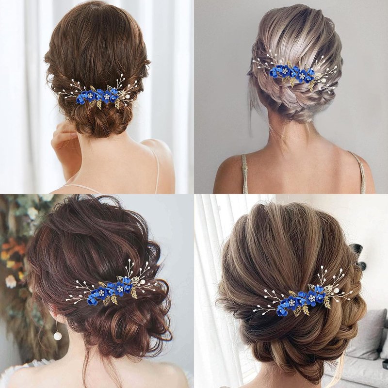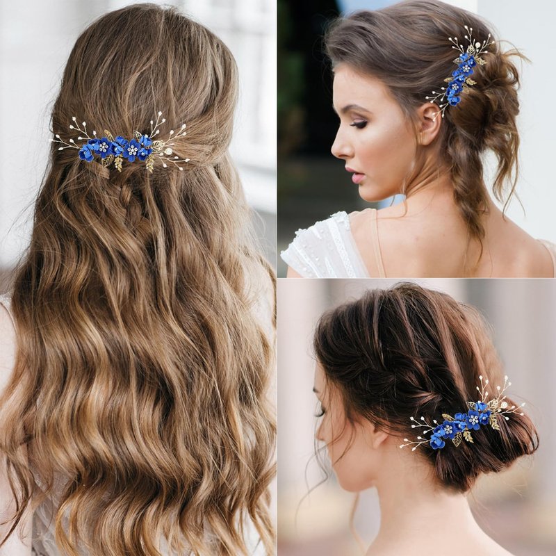 Wedding Hair Combs, Crystal Flwoer Hair Clips Bride Bridesmaid Hair Sides Comb Rhinestone Barrettes, Pearl Flower Hair Pins Hair Accessories for Women Girls (Royal Blue)