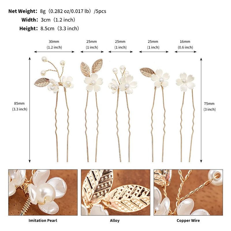 These elegant hair pins make a lovely accessory for any formal occasion. Decorated with delicate white flowers and gold leaves, they add just the right touch of glamour to updos. Whether worn individually or clustered together, they enhance sophisticated styles beautifully. Perfect for weddings and other special events, these hair pins also work well for proms, galas or nights out. Their timeless design means they can be reused many times, providing lasting value.