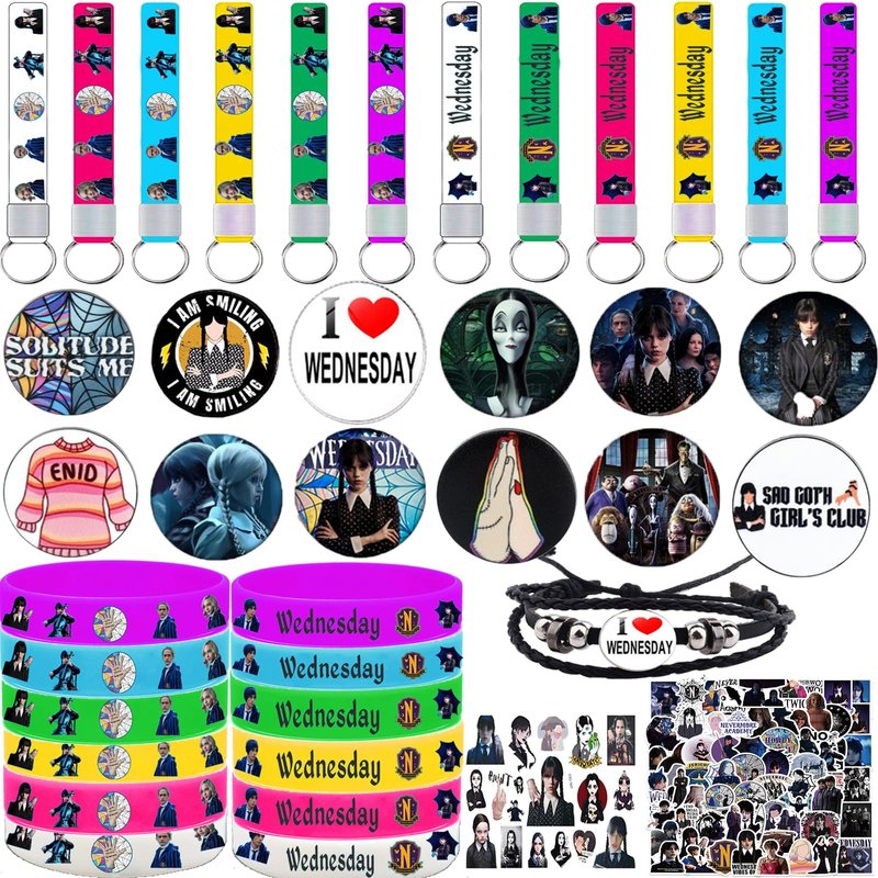 Wednesday Addams Party Supplies, 108 Pack Wednesday Merchandise Party Favors - 12 Bracelets, 1 Bracelet,12 Keychains, 12 Button Pins, 1 Tattoo Sticker Set of 70 Stickers for Fans