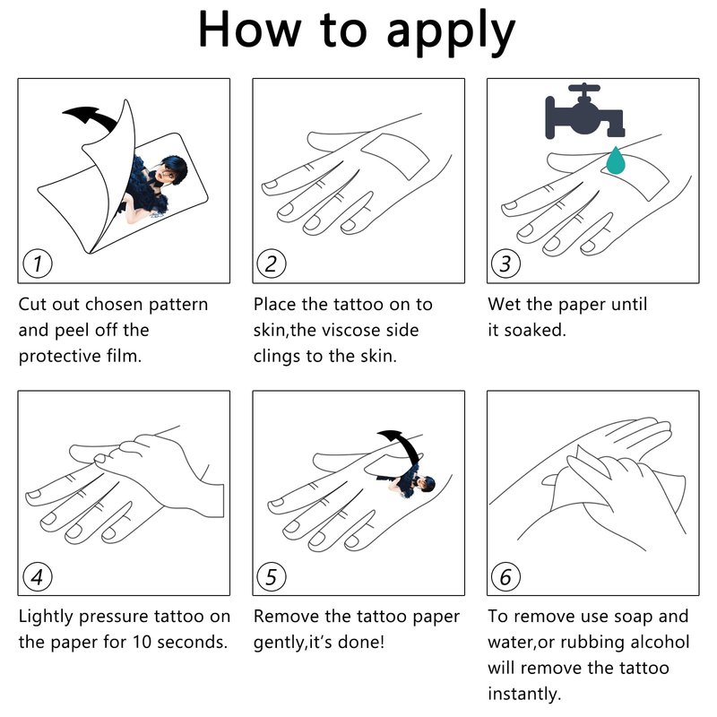 - 【Easy to Use】 Choose the one you like, and then face down on skin, wet the temp tattoo with water and wait for 10 seconds. Then gently tear off the white surface. You will get a Wednesday New Addams tattoo!