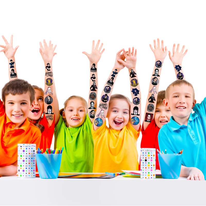- 【Wednesday New Addams Party Favors for Kids】 Perfect Wednesday New Addams Temporary Tattoos for kids party gifts, classroom rewards, giveaways, school exchange gifts, carnival prizes, goodies/candy bag fillers, party pinata filler and everyday play! You can also apply them to your body or some smooth objects, such as glass, tile, water bottle, paper, stainless steel, plastic, gift box, mobile phone case and so on.