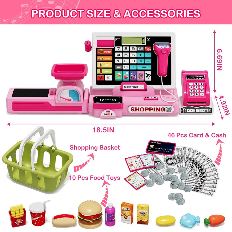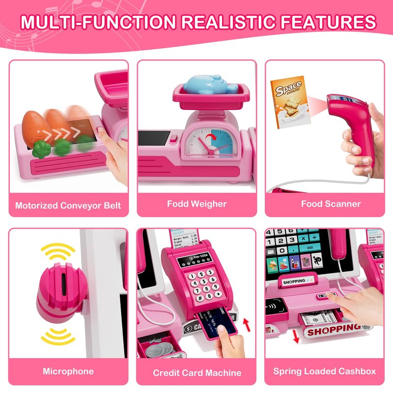 - 63 PCS MULTI-FUNCTION CASH REGISTER TOY: Upgraded motorized conveyor makes play store shopping experiences more realistic! This play cash register set also includes real calculator, scanner, microphone, basket, food toys, play money and credit card