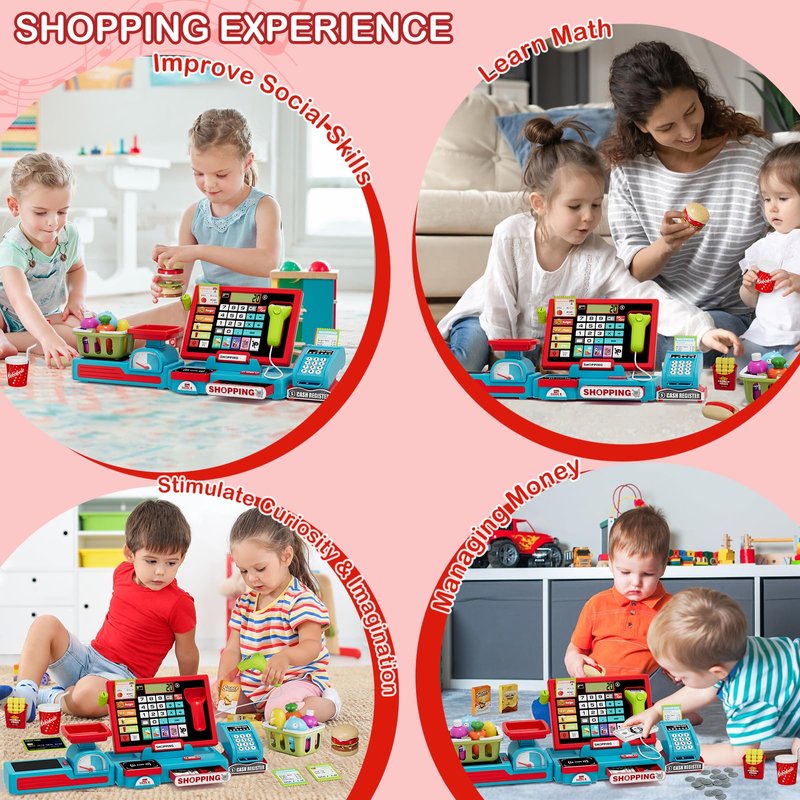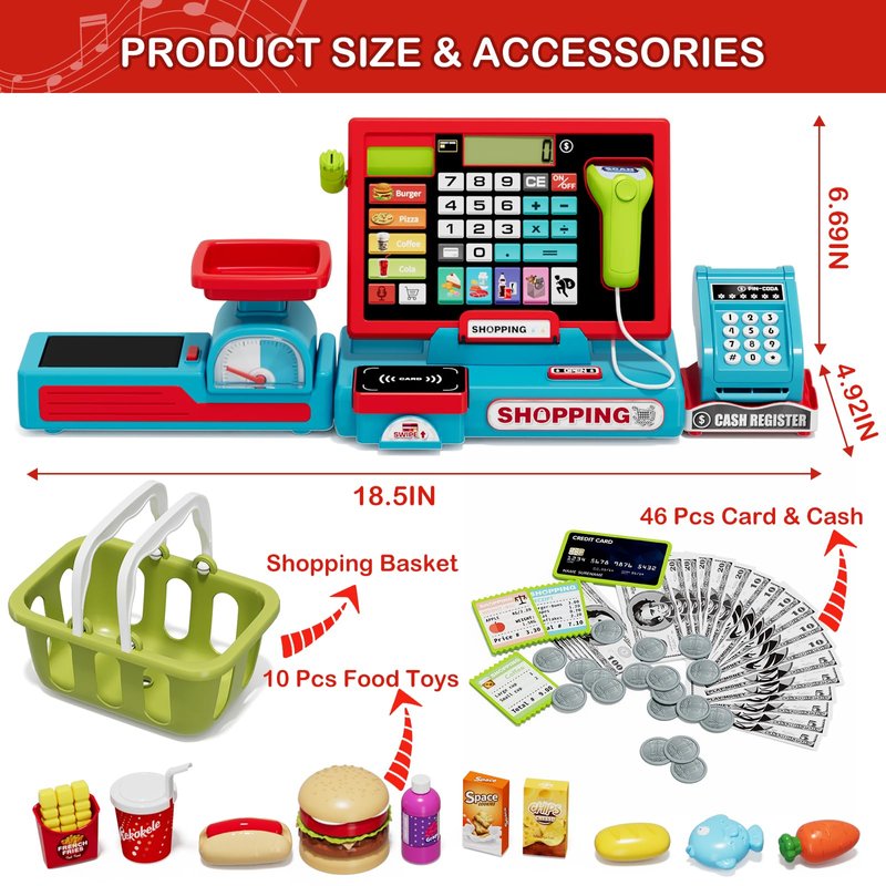 - 63 PCS MULTI-FUNCTION CASH REGISTER TOY: Upgraded motorized conveyor makes play store shopping experiences more realistic! This play cash register set also includes real calculator, scanner, microphone, basket, food toys, play money and credit card