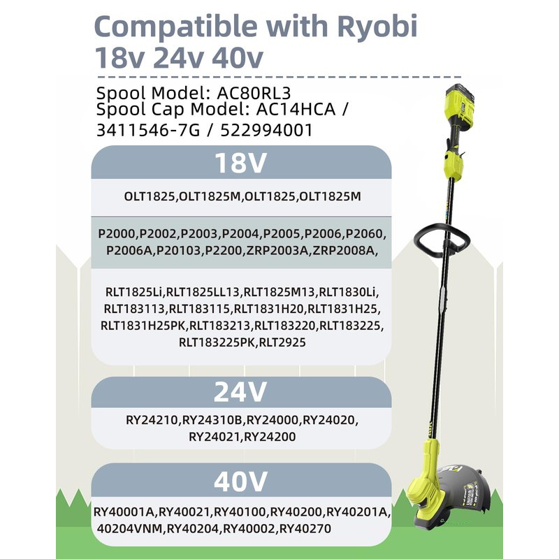 - 𝐂𝐨𝐦𝐩𝐚𝐭𝐢𝐛𝐥𝐞 𝐰𝐢𝐭𝐡 𝐌𝐮𝐥𝐭𝐢𝐩𝐥𝐞 𝐑𝐲𝐨𝐛𝐢 𝐂𝐨𝐫𝐝𝐥𝐞𝐬𝐬 𝐓𝐫𝐢𝐦𝐦𝐞𝐫𝐬 𝐌𝐨𝐝𝐞𝐥𝐬:This Line String Trimmer Replacement Spool is Compatible with Ryobi ONE PLUS+ Cordless Trimmer Models: 18V, 24V, 40V.
