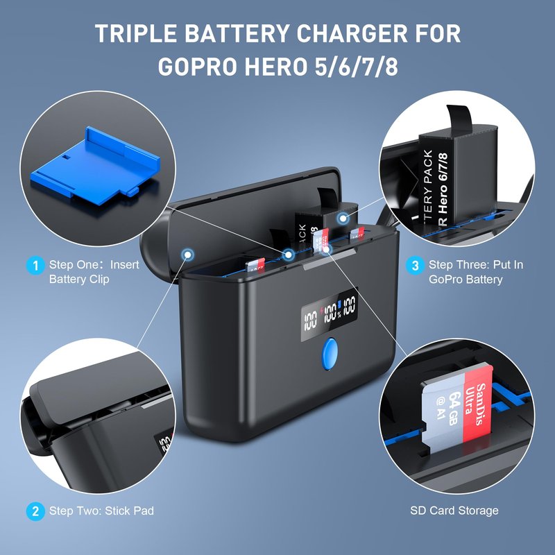 - 🔋【Perfectly Compatible】Our charger is compatible with the original GoPro Hero 11/10/9/8/7/6/5 battery. When using a charger to charge the GoPro 8/7/6/5 battery, You need to use a battery clip and pad to combine.