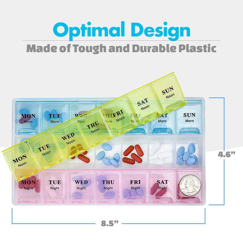 - EXCEPTIONAL DESIGN: The pill organizer has a contoured design for easy pill removal. It includes 21 large compartments and lets you store medicines in bulk. The box comes in bright and attractive colors.