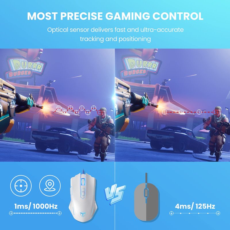 - 【Ergonomic Design, Less Fatigue】The ergonomic contour makes the PC gaming mice fit perfectly in any-size hands. Texture on the mouse is a super-fine rubber that feels comfortable and reduces your click fatigue during marathon multiplayer sessions.
