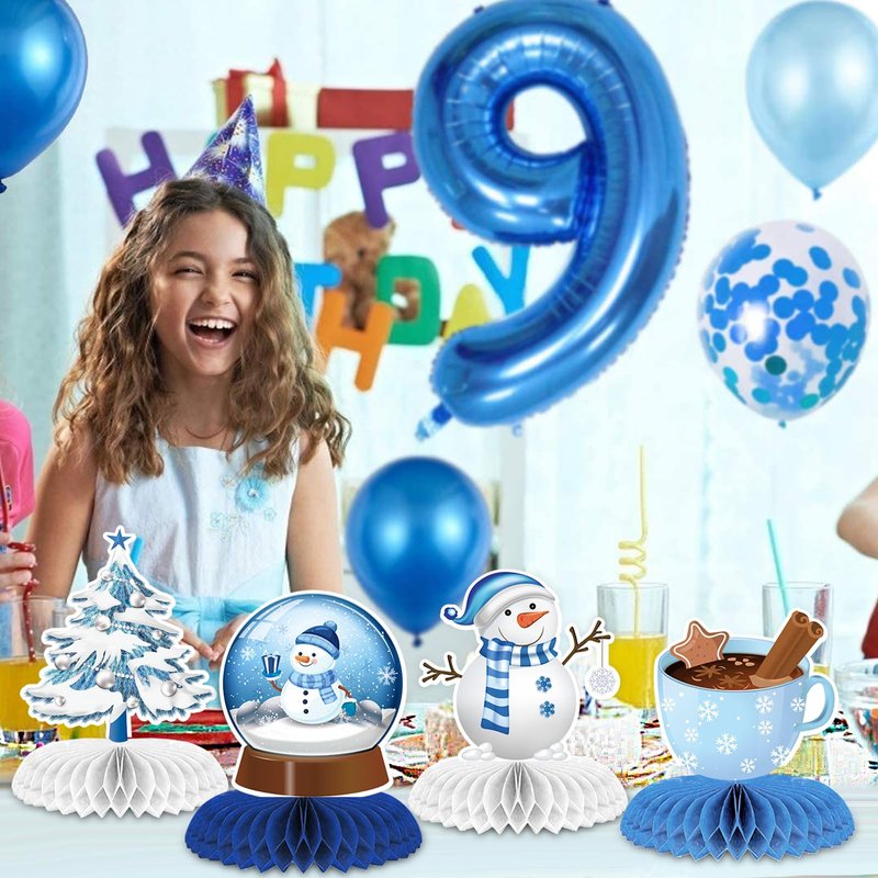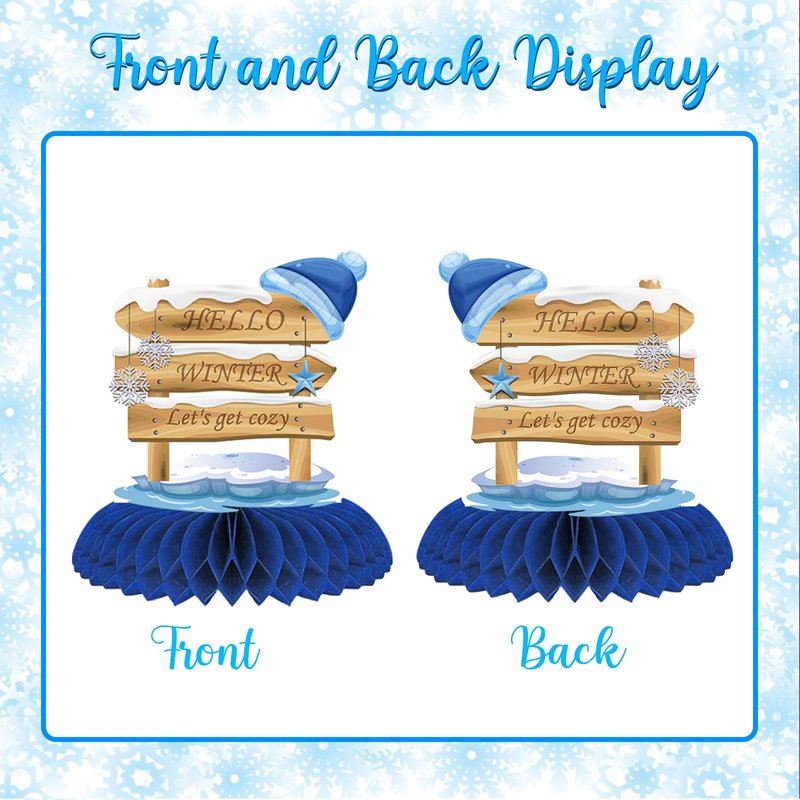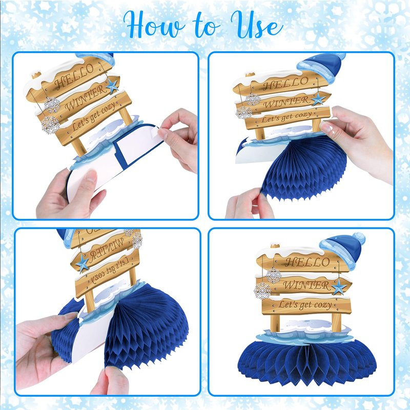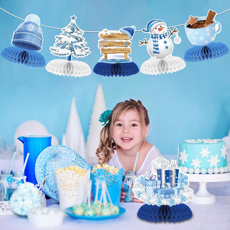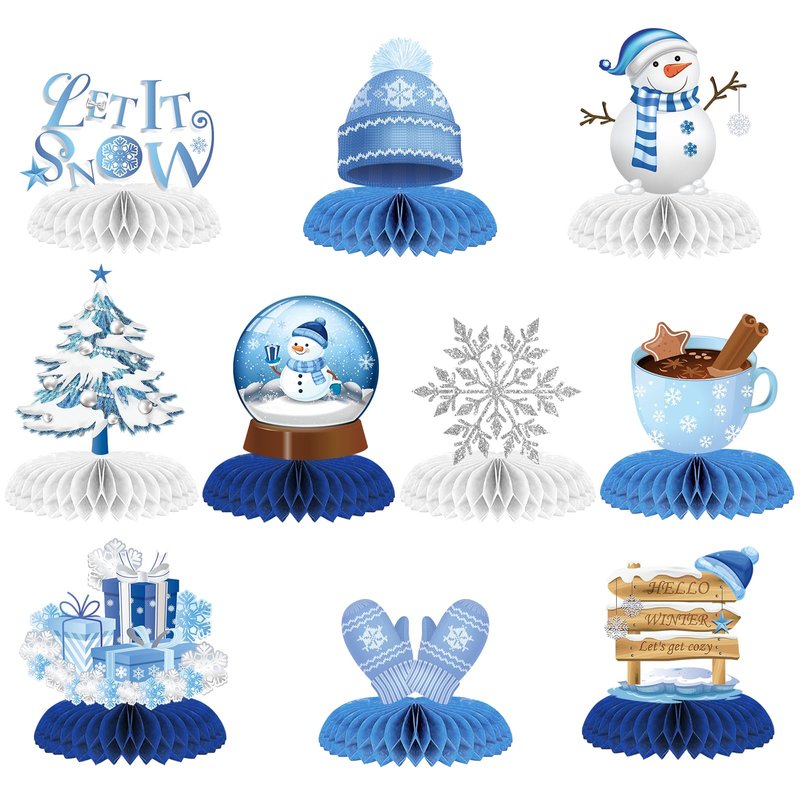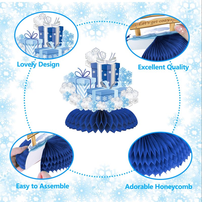 - 『Winter Theme Design』These snowflake honeycomb table centerpieces are brightly colored and are made up of classic winter elements including christmas tree, snowman, winter hat, gloves, crystal ball and more to grab people's attention at winter or Christmas parties.