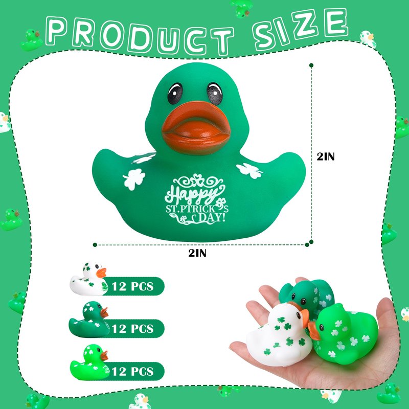 - Super Value Rubber Duckies: Our St.Patrick's day accessories Set includes 36 Pcs St. Patrick's Rubber Ducks in 3 color (green, light green and white), 12 pcs each color. Classic and fashionable duck toys looks cute and vivid and the quantities can meet your daily needs.