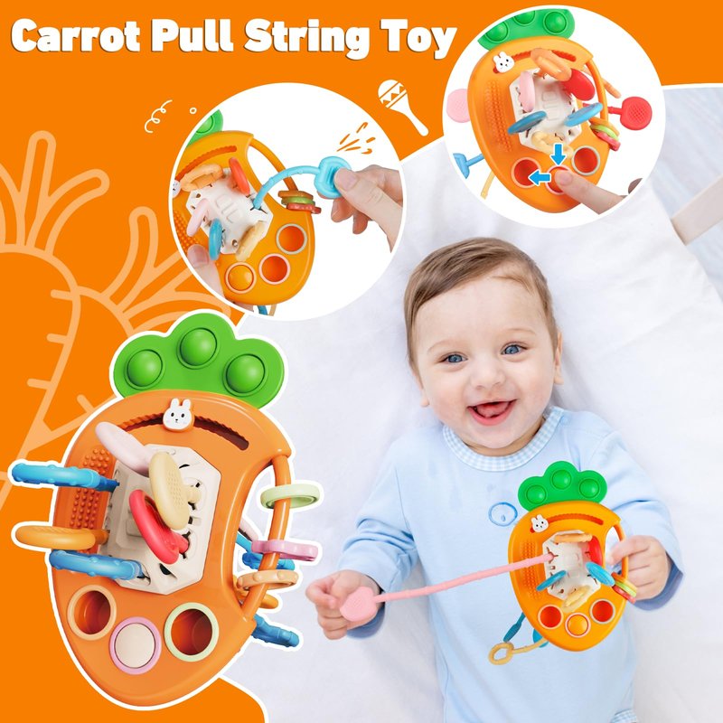 - Best Sensory Toys: Baby explore this adorable carrot shape pull string toy through pulling up and down, pressing, chewing, shaking, different colored strings promotes color learning. Textured cords, easy-to-hold grips and movable little rabbit promote fine motor skills, sensory exploration, fine motor skills and hand-eye coordination. Crafted with premium-quality, non-toxic ABS plastic, this safe montessori toy is perfect for babies aged 6-12 months