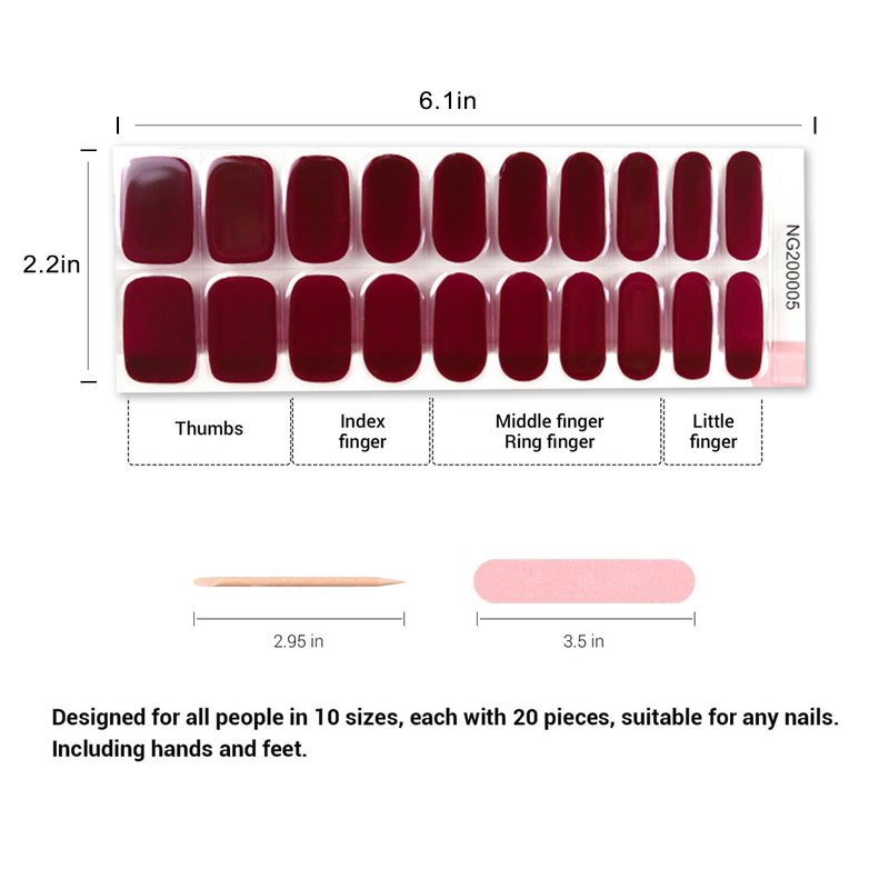 Wekcekcek 20pcs Semi Cured Gel Nail Strips, Real Nail Polish Art Stickers, Burgundy Gel Nail Stickers - Work with Any UV Lamp, Long Lasting Full Nail Wraps with Nail File and Stick