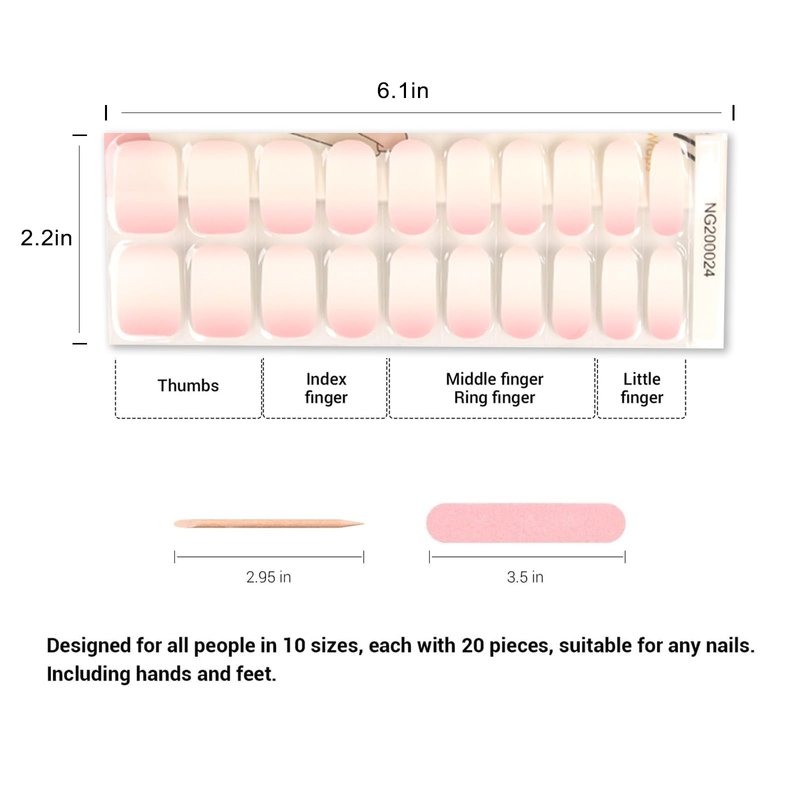 - 【GEL Nail Art Stickers Set】- Package dimensions - Approximately 7*2.6 inches. Each set includes 20 pcs of nail art stickers in 10 different sizes. Bonus items - 1 nail file and 1 wooden stick (UV Lamp not included)