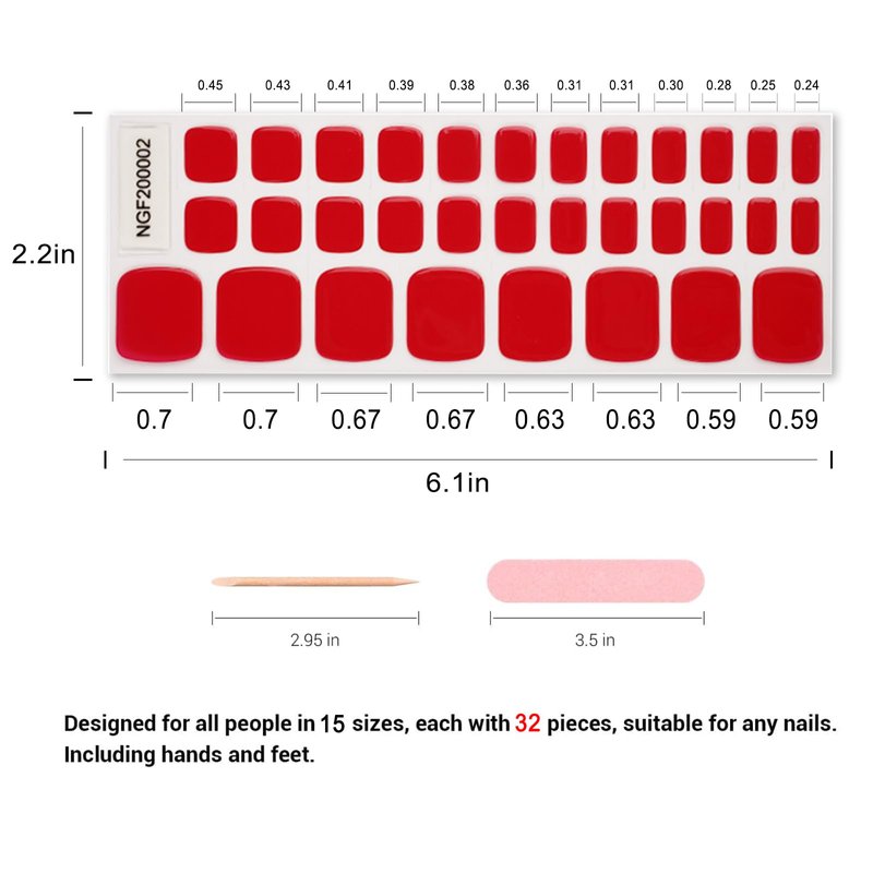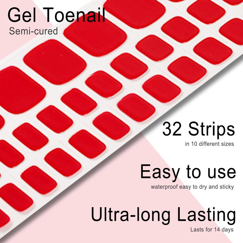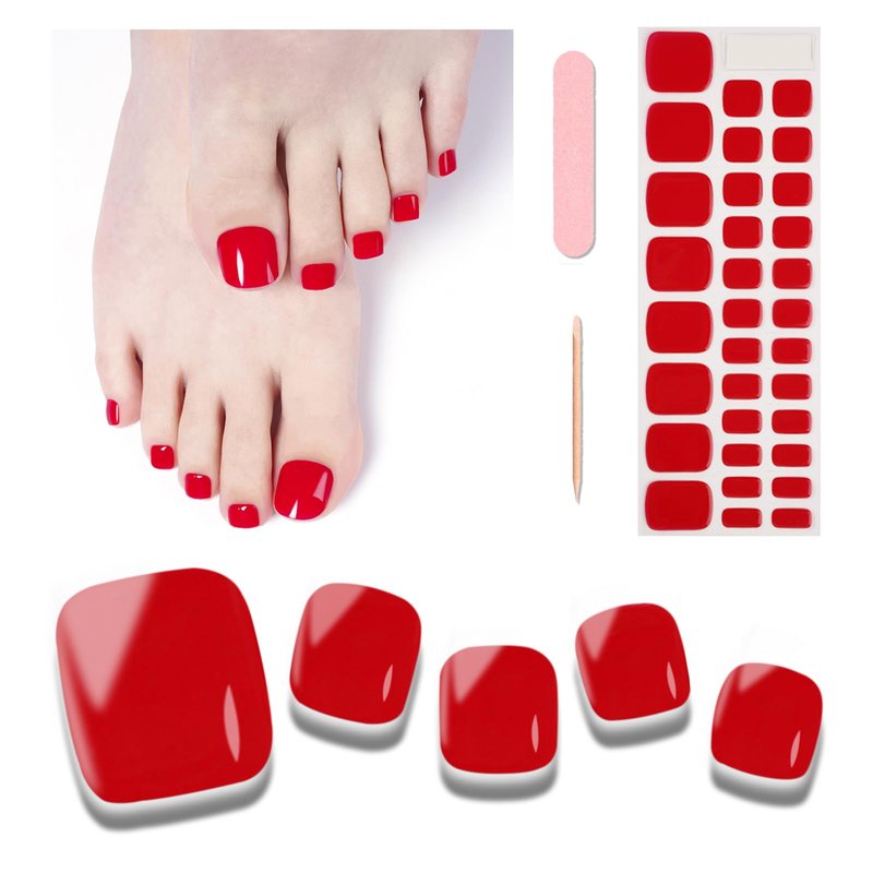 Wekcekcek Semi Cured Gel Toenail Strips, 32 Scarlet Fiery Toenail Stickers Pedicure Strips Salon Quality Nail Wraps with Nail File & Wood Stick(UV/LED Lamp Required)