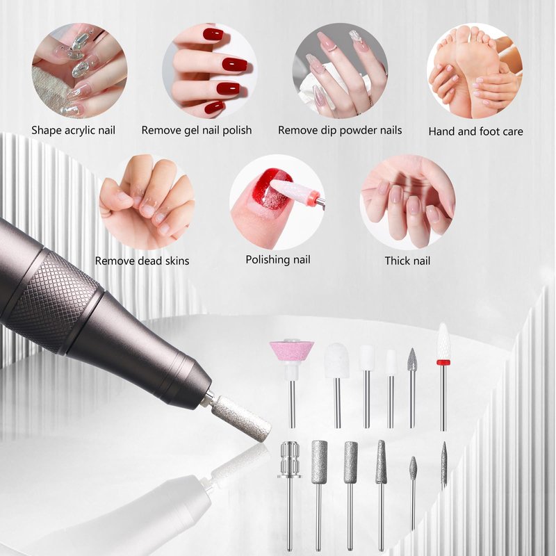 - ★【Portable All In One Nails Drill Kit】 It comes with 12pcs nail drill bits, 6Pcs sanding bands for all kinds of manicure or pedicure. Compact and lightweight design makes this pen shape nail grinder easy to pack with your stuff, It is a perfect multi-functional nail drill gift set for both professionals and beginners.
