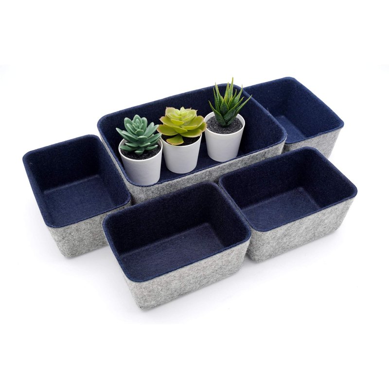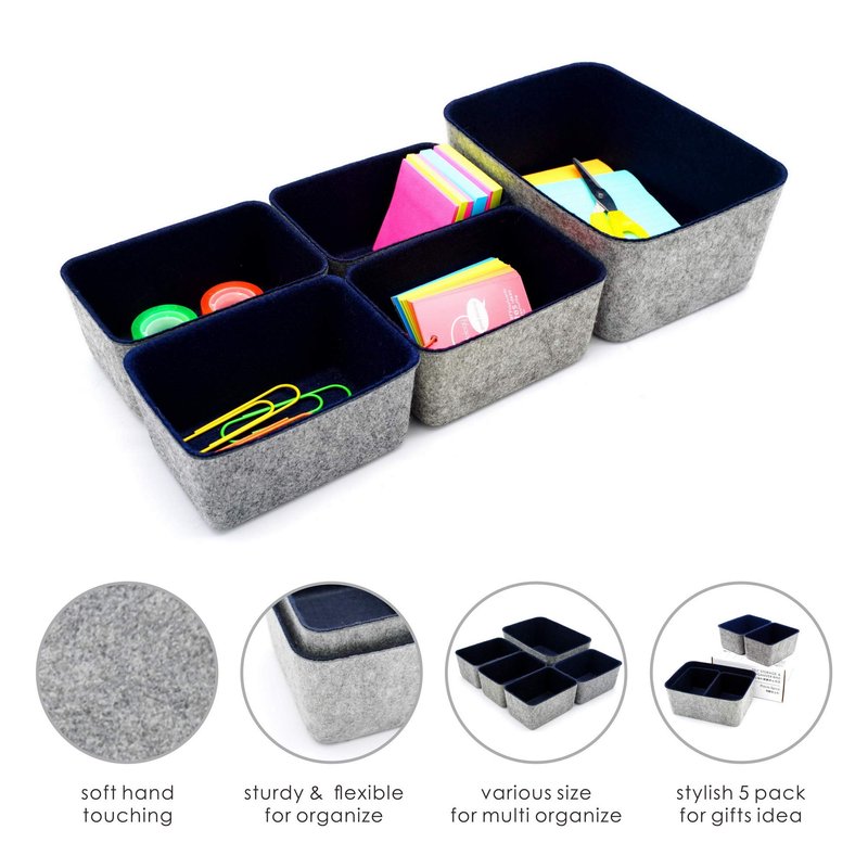 ●Made of recycled felt ● Size 1 bigger bin of 8.9 x 6.3 x 3.7 inch, and 4 bins of 5.9 x 3.9 x 2.8 inch ●. 2 tones color bins, grey with navy inside, with small accessories, pen,sticky notes ,pencil, art brush, Jewelry etc in the bin to fit in the drawer or on the desk ●.organize each in clean and modern lifestyle