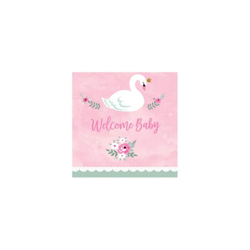 "Welcome Baby" Girl Baby Shower, Swan Beverage Napkins, 5" x 5", 16 Ct.