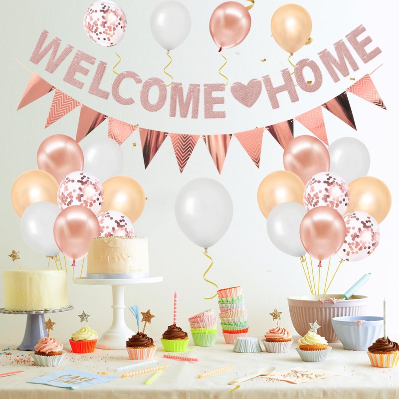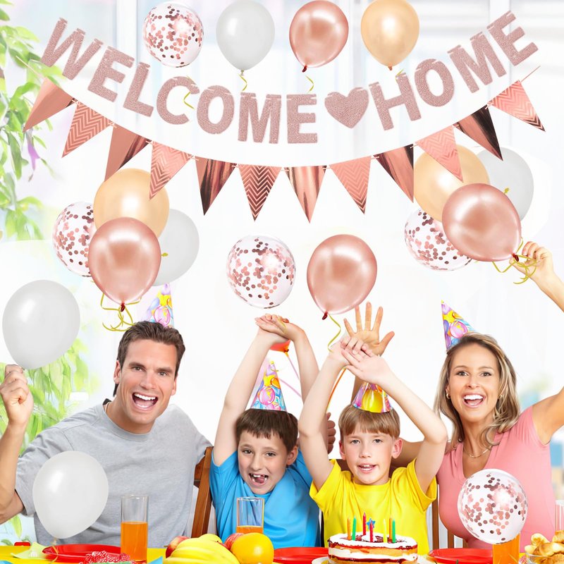 - WELCOME HOME DECORATIONS INCLUDES:5pcs Rose Gold Balloons(10"),5pcs White Balloons(10"),5pcs Champagne Gold Balloons(10"),5pcs Rose Gold Confetti Balloons(12"),1pcs "Welcome Home" Banner,1pcs Gold Pennant Chain,Ribbon.
