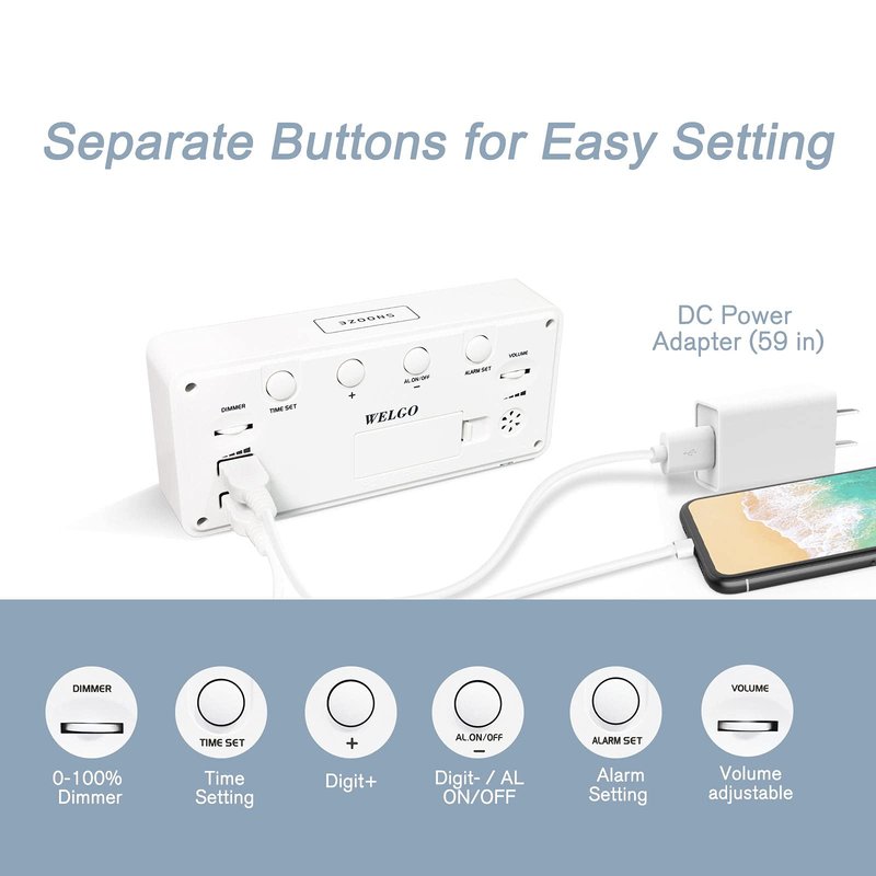 Welgo 7.5 Inches Huge Digital Alarm Clock for Seniors & Visually Impaired, Easy Set, USB Charging Port, 0-100% Dimmer, Snooze, Adjustable Volume, Outlet Powered for Bedroom