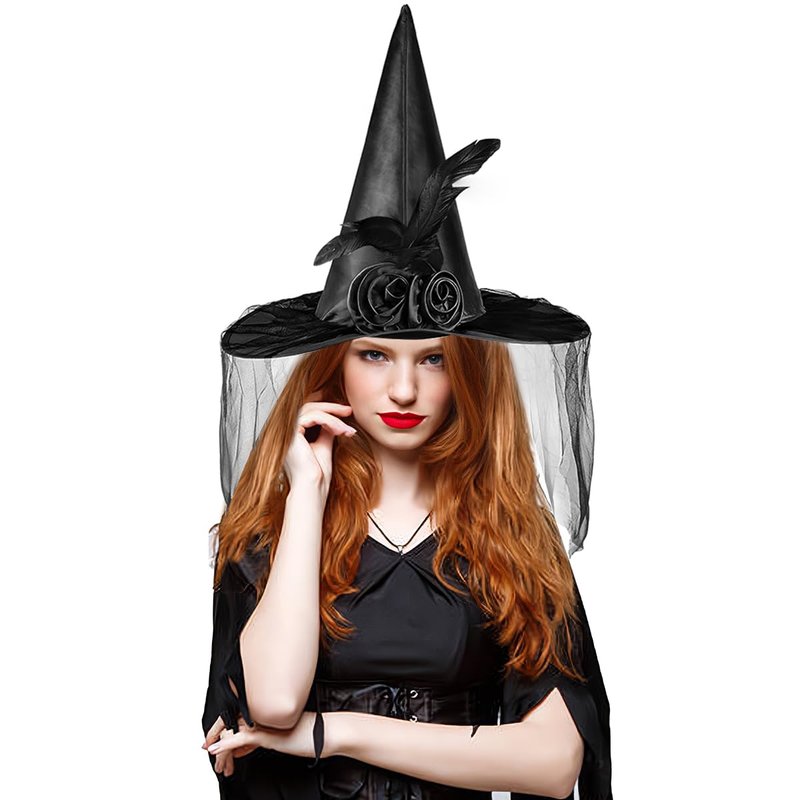 Welkin Halloween Black Witch Hat for Women with Soft Lace Mesh Rose& Feathers,Black Foldable Pointed Cap for Halloween Witch Costume or Halloween Party