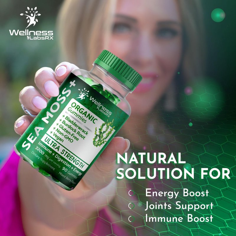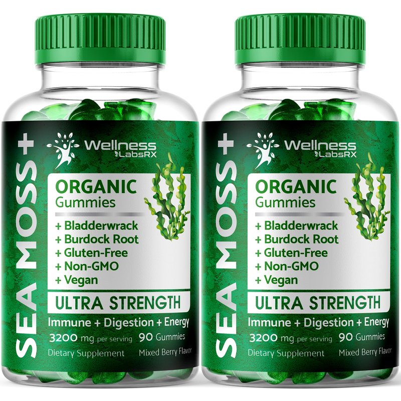 WELLNESS LABSRX Sea Moss Gummies, 3200mg Organic Seamoss, Irish Sea Moss with Maximum Potency Bladderwrack and Burdock Root - Supports Skin and Joint Health - Pack of 2