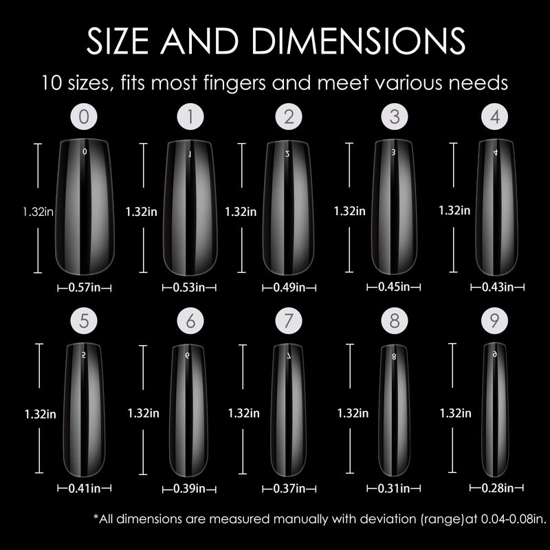 - Applicable for All Tip Size – Wellquinn provides 360pcs full coverage tapered square nail tips that comes in 10 different sizes. There are 30 pieces of nail tips in each size, include extra size 5 and 6 sizes as these are the most commonly used size, which fits most fingers and meet various needs. Each nail tip is individually numbered so you’ll definitely find your false nail tips to fit your natural nails - from thumb nail to pinky nail