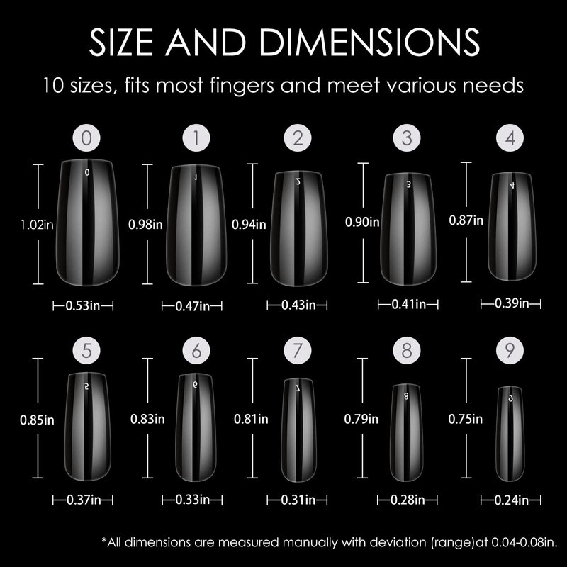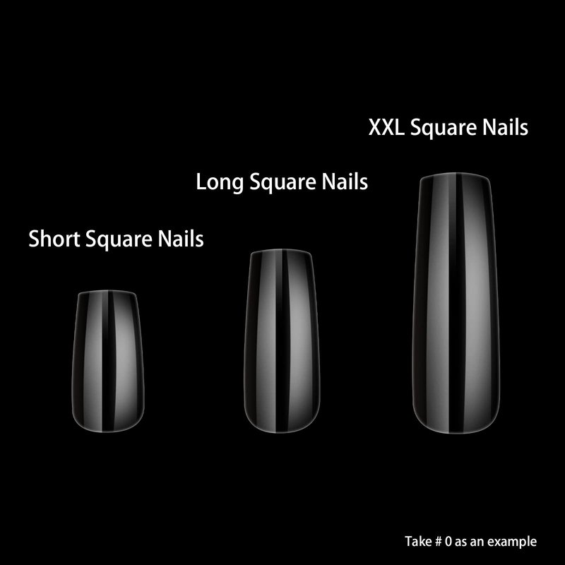 - 10 Sizes Tips Fit Your Nails: 0-9 nail sizes, the clear square press on nails has 10 different sizes, include extra size 5 and 6 sizes as these are the most commonly used size, get your perfect customized fit