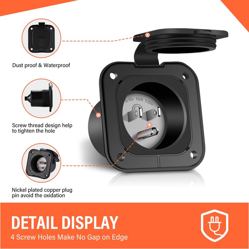 - 【15 Amp Flanged Inlet】: No oxidation for the Nickel coated copper pole on the plug, made of premium copper and Nylon plastic to avoid the damage of UV degradation and chemicals, rugged and durable for indoor and outdoor.