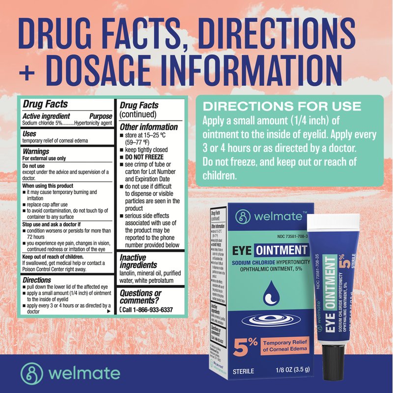 WELMATE - Eye Ointment - Sodium Chloride Hypertonicity Ophthalmic Ointment 5% - Temporary Relief of Corneal Edema Symptoms - Sterile - Eye Care & Personal Care Products - 1/8 OZ (3.5 g)