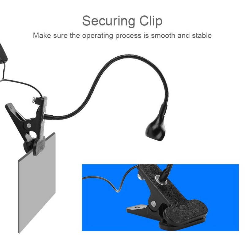 - UV GLUE CURING LAMP: The UV LED desk lamp clip is designed with a 30 cm long gooseneck and a 6 cm wide stable clip. The USB power cord is about 120 cm long, which can be flexibly rotated and carried at different angles.