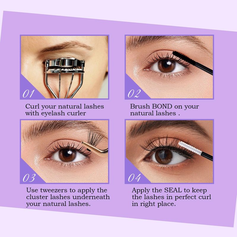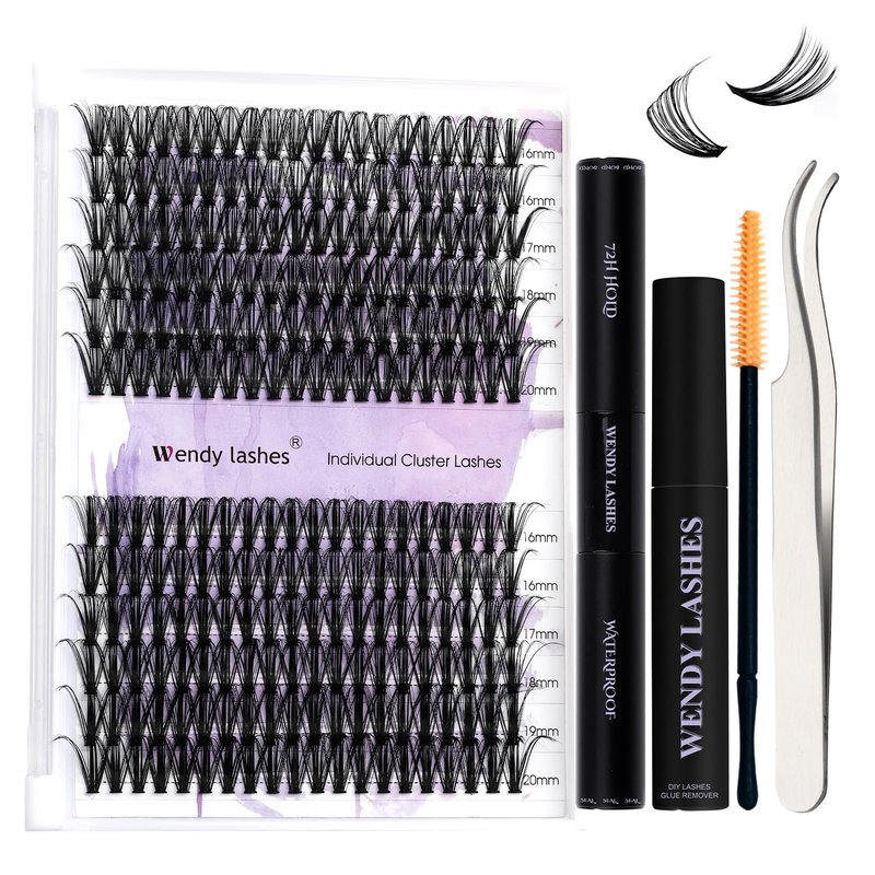 Individual Clusters Lashes Kit: Wendy lashes cluster extensions kit has a natural lashes cluster, a lash bond and seal, a eyelash remover, a eyelash applicator and lash brushes. The wispy cluster lashes are 3D effect curl and a super thin sharp tips, similar in thickness to real eyelashes.2 Style Reusable Clusters: Wendy lash clusters have 2 different kind of clusters in one tray. They are soft and not sting eyes, lightweight and no burden when you wear lashes. And eyelashes are unique design, can enlarge and highlight your eye makeup.Strong Hold Lash Bond and Seal: This lash bond offers a 72 hours long lasting and strong hold. The lash bond and seal glue is waterproof and oilproof. The individual clusters glue is suitable for cluster lashes, DIY lash extensions, individual lashes.Good Cleaning Lash Remover: Lash cluster remover has a strong cleaning, it can quickly dissolve cluster lash glue, bond and seal. Eyelash glue remover can clean eyelash glue, grease, dust and makeup residue.Eyelash Applicator with Comb: The cluster lash applicator is golden color with a comb on the tail. Tweezers for lashes are made of superior stainless steel, perfectly aligned no gaps, has a great grip. Cluster lashes applicator can easily pick up the cluster lashes and apply individual lashes extensions.