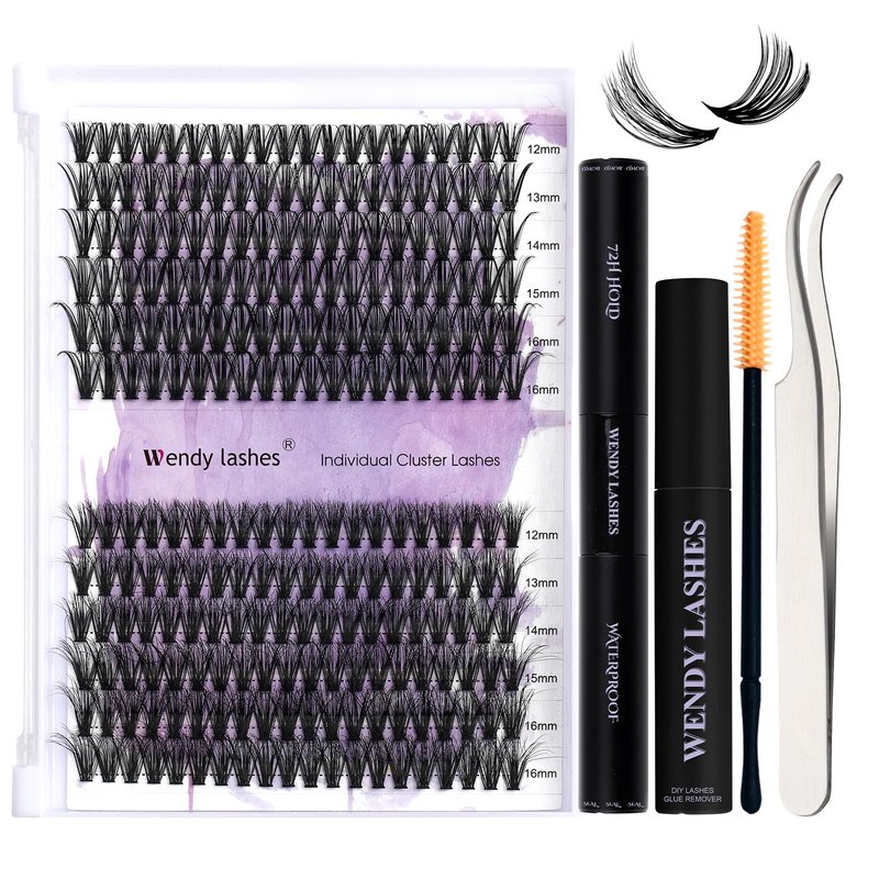Individual Clusters Lashes Kit: Wendy lashes cluster extensions kit has a natural lashes cluster, a lash bond and seal, a eyelash remover, a eyelash applicator and lash brushes. The wispy cluster lashes are 3D effect curl and a super thin sharp tips, similar in thickness to real eyelashes.2 Style Reusable Clusters: Wendy lash clusters have 2 different kind of clusters in one tray. They are soft and not sting eyes, lightweight and no burden when you wear lashes. And eyelashes are unique design, can enlarge and highlight your eye makeup.Strong Hold Lash Bond and Seal: This lash bond offers a 72 hours long lasting and strong hold. The lash bond and seal glue is waterproof and oilproof. The individual clusters glue is suitable for cluster lashes, DIY lash extensions, individual lashes.Good Cleaning Lash Remover: Lash cluster remover has a strong cleaning, it can quickly dissolve cluster lash glue, bond and seal. Eyelash glue remover can clean eyelash glue, grease, dust and makeup residue.Eyelash Applicator with Comb: The cluster lash applicator is golden color with a comb on the tail. Tweezers for lashes are made of superior stainless steel, perfectly aligned no gaps, has a great grip. Cluster lashes applicator can easily pick up the cluster lashes and apply individual lashes extensions.