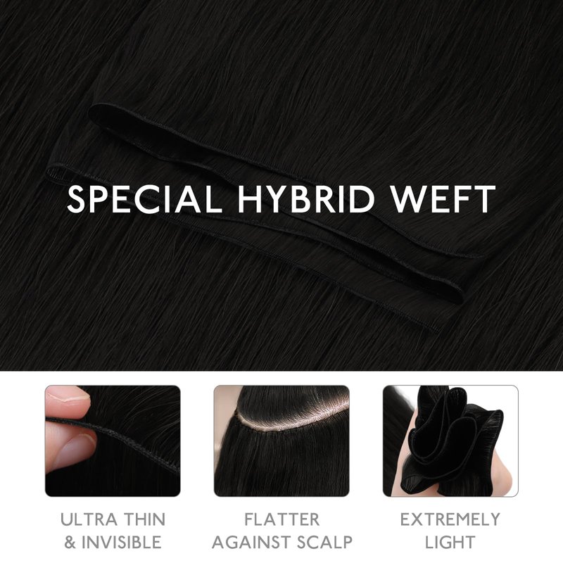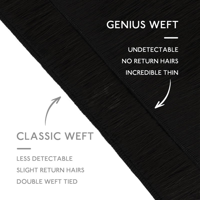 The genius new weft is a groundbreaking weft, designed exclusively for salon professionals. Each strand of the enhanced hair is crafted from luxurious Remy hair, offering durability and high quality, making it an ideal choice for adding volume. The upgraded hair has double the lifespan, lasting at least 5 months. Unlike classic weft, the track of genius weft is significantly thinner(1.78mm) making them ideal for those with thin to medium hair, the ultra-thin genius weft lies flatter against the scalp, reduces tension, and offers superior comfort with no return hair.