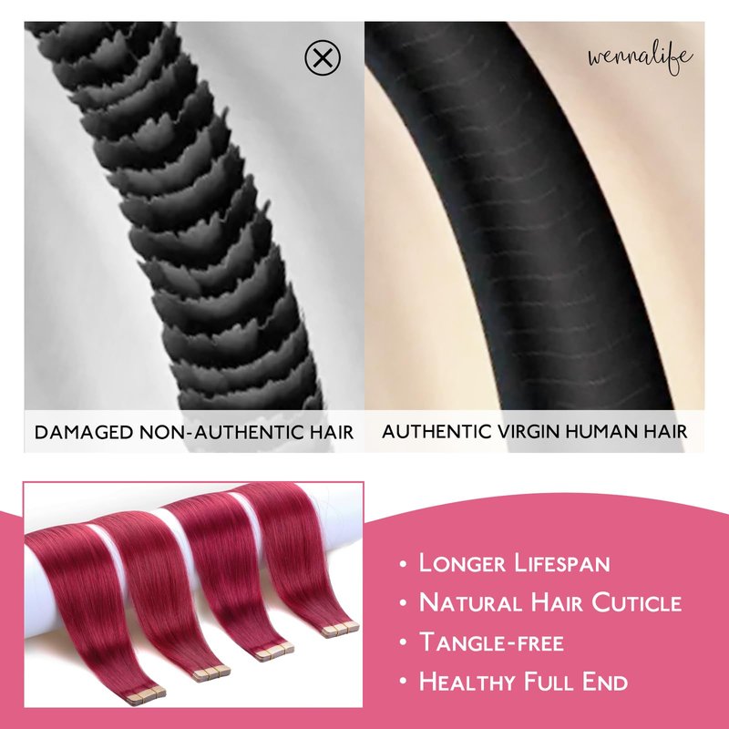 - 【Colorful Real Human Hair】Elevate your style personality but want to limit hair damage, try out WENNALIFE's glossy, multidimensional colored tape in hair extensions human hair! With proper care, WENNALIFE tape ins maintain softness, shine, and tangle-free durability, for up to last 3-4 months. Tips: Please avoid wearing light-colored clothing when wearing color-toned hair extensions. Our real human hair extensions can be restyled easily(under 250F), but we don't recommend recoloring them.