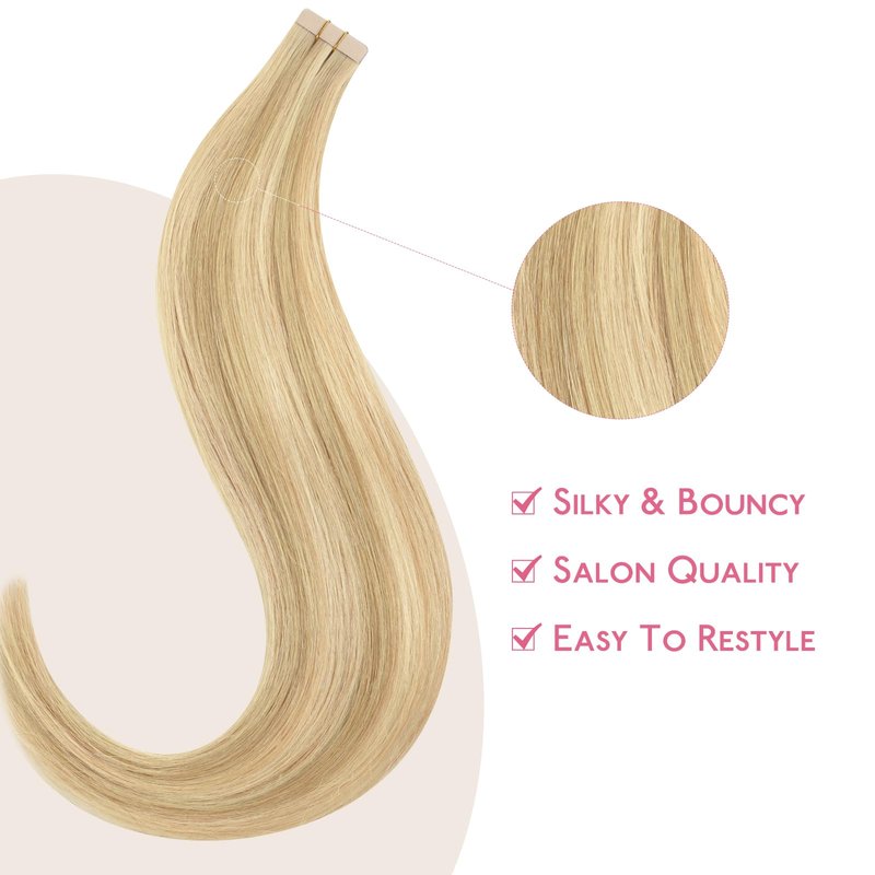 WENNALIFE Tape in Hair Extensions Human Hair Light Blonde Highlighted Golden Blonde Tape in Extensions, 10pcs 20g 10 inch Remy Invisible Tape Ins Straight Soft Real Human Hair Tape in Extensions