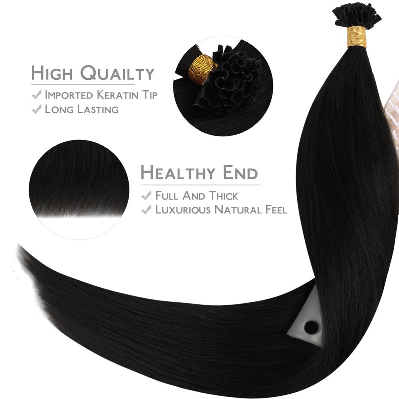 - 【Perfect Color Match】Jet Black. The blackest black, this cool-toned shade has blue undertones throughout for enhanced shine and gloss. From classic solid to balayage highlights, our salon-worthy shades and extensive color range guarantee a seamless blend. Get smooth, shiny keratin hair extensions quickly. It is recommended to make a color choice based on the color of your hair in natural light. Professional color match help is always here!