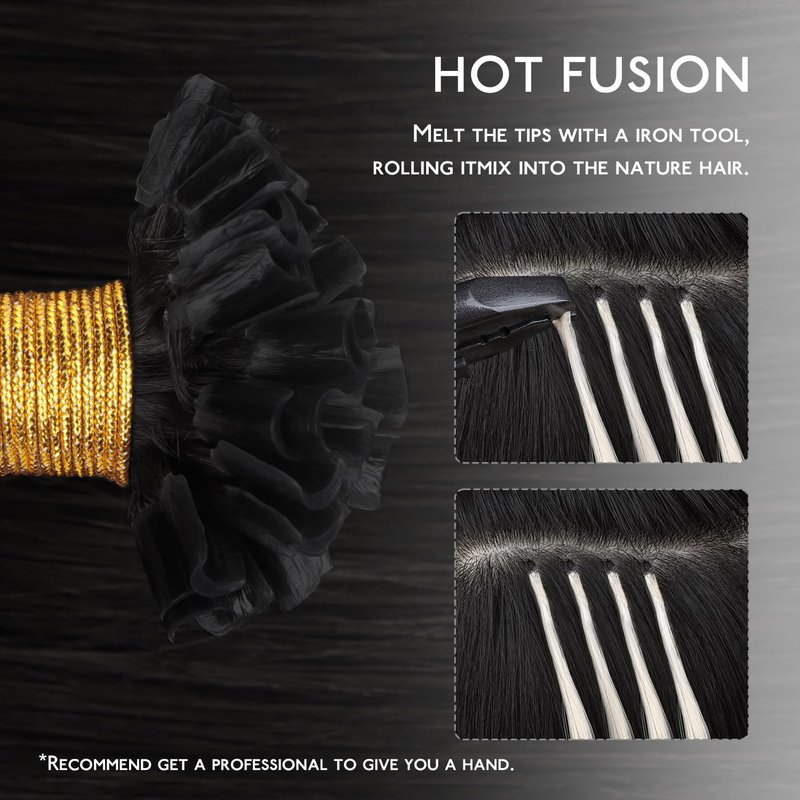 - 【Hot Fusion Installation】It is important to note that utip hair extensions are recommended to be performed by a professional hairdresser to ensure safety, and to achieve the desired aesthetic effect. After applying extensions, avoid using high-temperature tools directly on the roots to prevent damaging the adhesive and hair strands from falling out. Regularly check extensions; repair or replace loose or broken ones promptly for prolong life. Disassembly requires professional assistance.