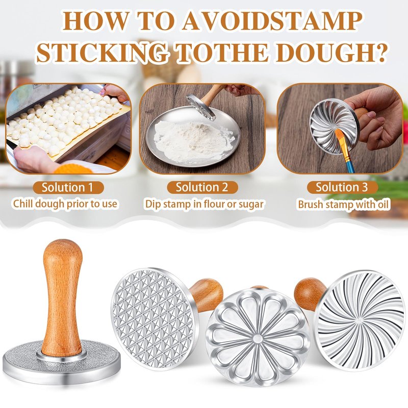 - Tips for Ideal Stamping: get ideal results by chilling the cookie press stamp before using it, always use cold dough; If sticking occurs, dip the stamp in flour or sugar or brush with oil; Simply roll the dough into a ball and press to make; Your baking ritual is about to become easier and more enjoyable