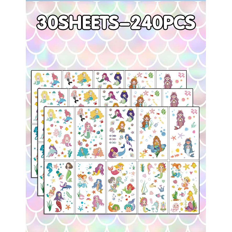 - Package Contents: You'll receive 30 sheets of mermaid tattoos, comprising 240 pieces in 80 distinct designs. Each sheet measures 2.7 x 4.8 inches, ensuring ample supply for your mermaid party games.