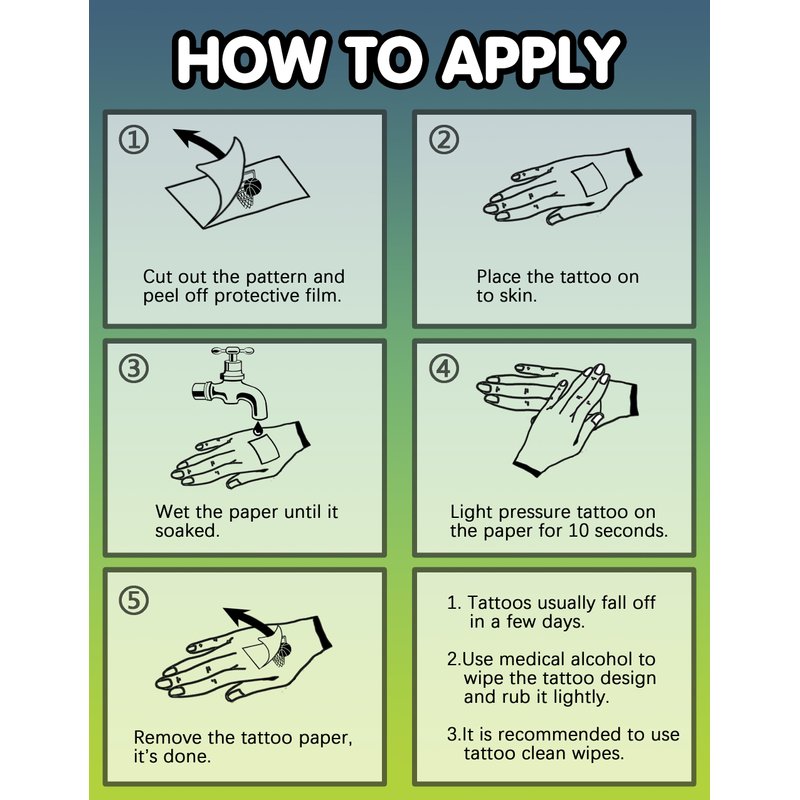 - User Guide: These mermaid-themed party favors are a breeze to use. Simply peel off the protective film, apply the tattoo to your skin, wet it, and press for 15 seconds. Remove with micellar water or makeup remover.