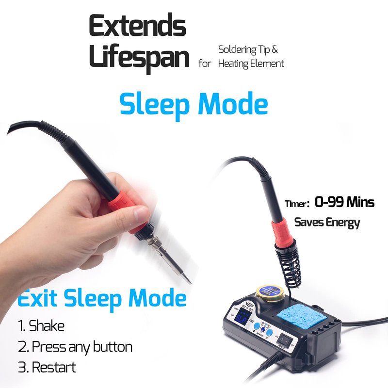 - User-friendly functions: 3 preset channels save you the hassle of repeated temperature configurations. You can save your usual temperature settings and press one button to toggle between channels. Sleep mode allows the soldering station to rest in low temperature when not in use for an extended period, thus reducing wear on the soldering iron and prolonging the lifespan of the soldering station. You can set the timer from 0 to 99 minutes.