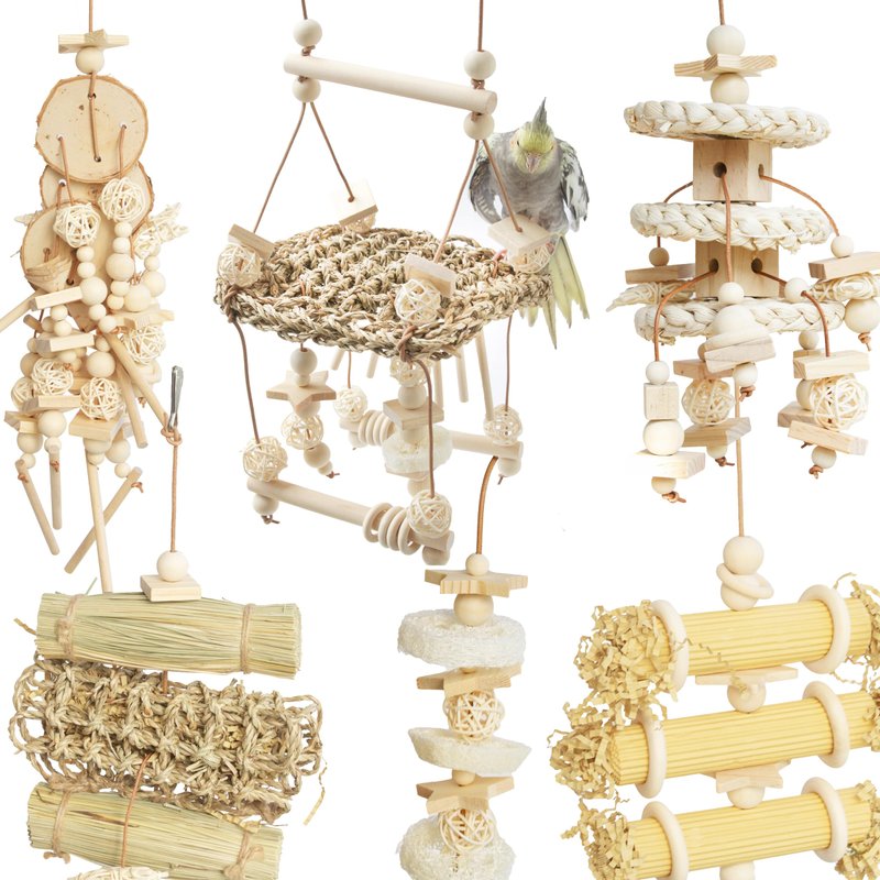 - NATURAL AND DYE-FREE: Our bird play set is made from natural materials without any added dyes or artificial colors. It is composed of natural seagrass, vegetable-tanned leather string, wood, woven vine, luffa, Corn husk, Birch wood, Crinkly paper.