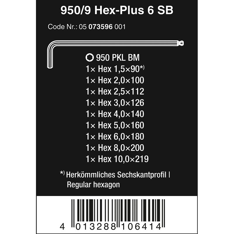 Wera - 5073596001 Hexagon 950 PKL/9 BM SB L-Key Set, BlackLaser, Ballpoint Hex Key, 9 Piece