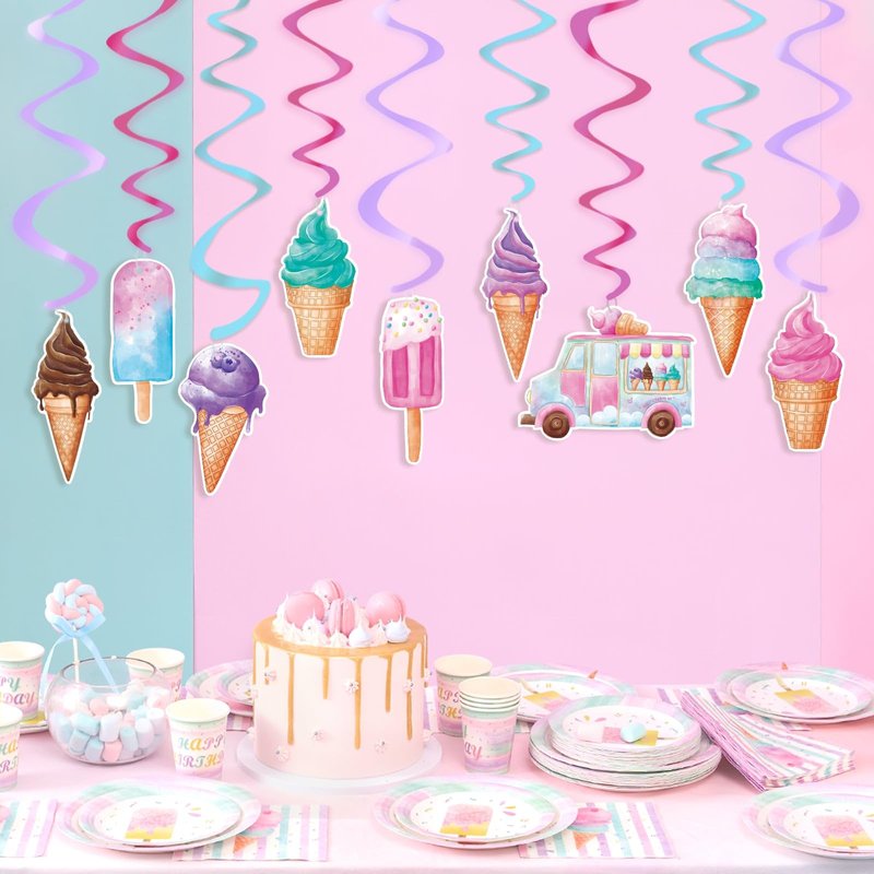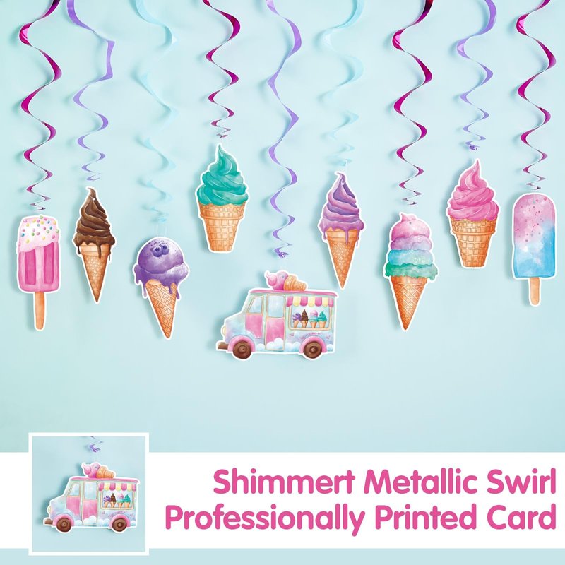 - Premium Quality:Our Ice Cream hanging sweet swirl is made of quality cardboard, printed on both sides, not easy to fade, firm and reusable; Ice Cream hanging swirl will make your ice cream party look sweet and interesting.