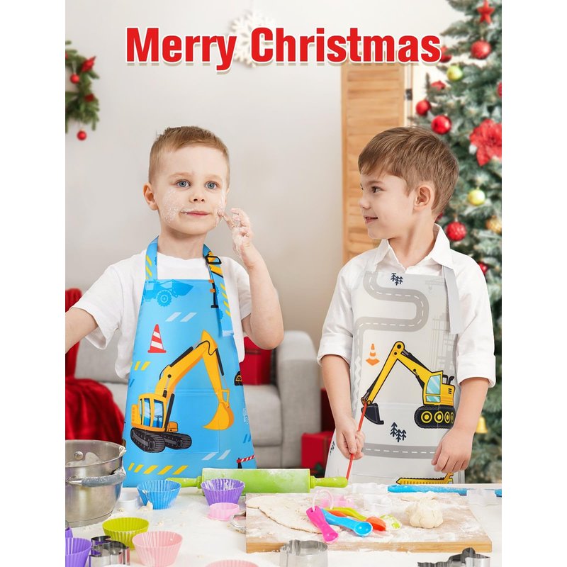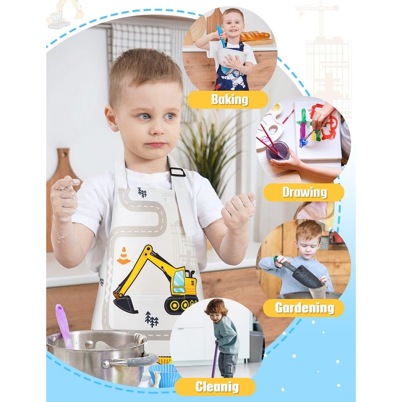 - 【EXCAVATOR DESIGN】If your boys wants to do crafts, gardening or other activities, an excavator patterned apron for kids can help him. The package includes of a blue apron and a grey apron for your needs!